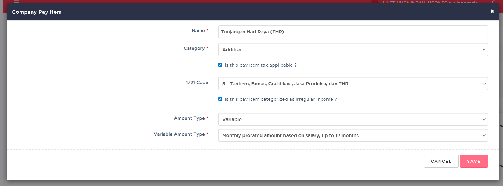 5. Ensure you've updated the Pay Item setting for THR shown in the picture below. Click SAVE to proceed.